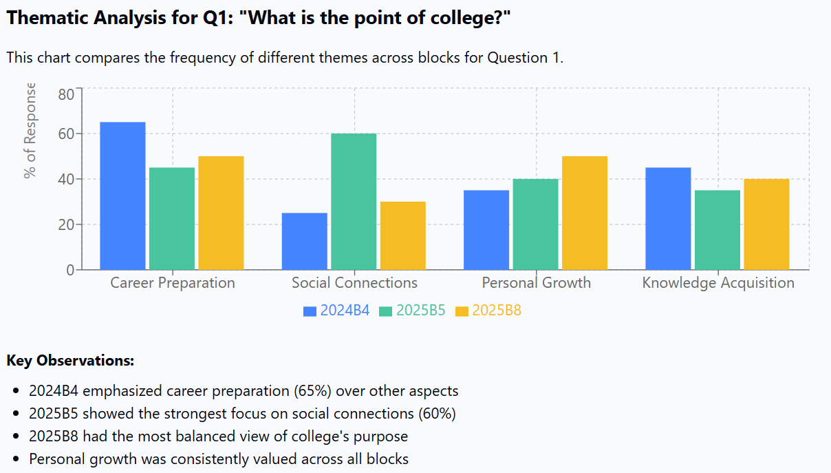 The GenAI team was also able to tell me that lexical sophistication (measured by TTR, the Type-to-Token Ratio) was highest for this class (a 300-level Econ election) and lowest for one of the Principles sections. This led to a great conversation about whether they had greater sophistication because they had actually learned something since they took Principles, or whether the kinds of students who select into upper-level econ classes are different from the get-go. Look at that. We even got to touch on human capital building v. the signaling value of college. On Day 1.