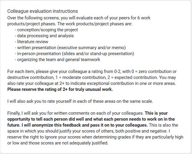 Second, in order for the students to take ownership over the project, it is essential that they not see me as the boss. Therefore, I can’t be the one assigning grades. Making the project grade entirely composed of colleague evaluations makes it clear to the students that their colleagues are the people they are responsible to, not me.
