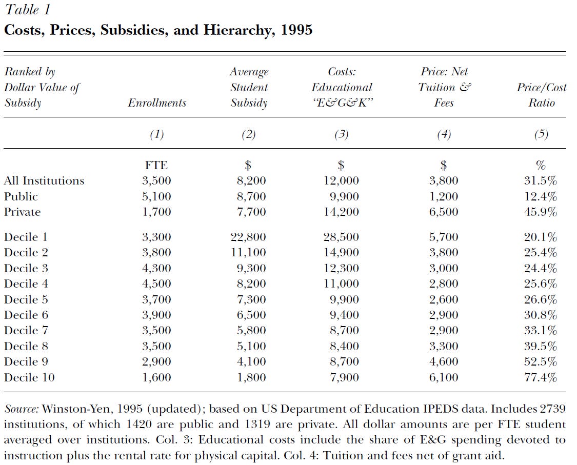 Wealthy schools pay a subsidy to all students because the existence of that subsidy pushes demand up above supply; this excess demand allows wealthy schools to be choosy about who they admit; this selectivity then pushes the average student quality up, which in turn increases demand. Schools that are able to select for high student quality can then employ different production and teaching techniques, namely those that rely on high quality peer effects. Small classes, residential college, peers of the same age, no online classes, etc. The concentration of high quality students and high intensity production techniques is in turn related to better post-graduate incomes and outcomes, thereby increasing donations. Larger endowments then afford the possibility of offering larger subsidies to future students, and so on and so forth forever. It is precisely this feedback loop that generates hierarchy in higher education.