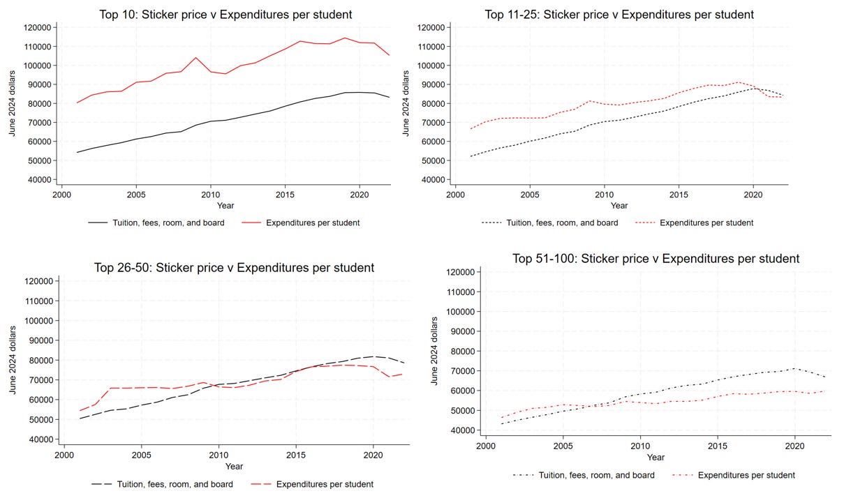 What you may not know is that for many schools for many years, ALL students paid less than the full cost of their education, even students paying the full sticker price. I wrote about this in a previous Substack post; the money chart is below. These charts show information for the top 100 liberal arts colleges for the years 2000-2023. You can see that the top 10 liberal arts colleges (the top left figure) are spending approximately $20,000 per student more than their full price tuition, fees, room, and board (a.k.a. the sticker price). Schools in the top 11-25 slots (top right) were spending $15k more per student than the sticker price in the early 2000s (in constant 2024 dollars, i.e. adjusted for inflation terms), but since 2020 are spending about equal to the sticker price. The switch point for schools in the Top 26-50 range (bottom left) switched over charging full-pays more than their average expenditures per student around 2009, while schools in the 50-100 range (bottom right) switched around 2007.